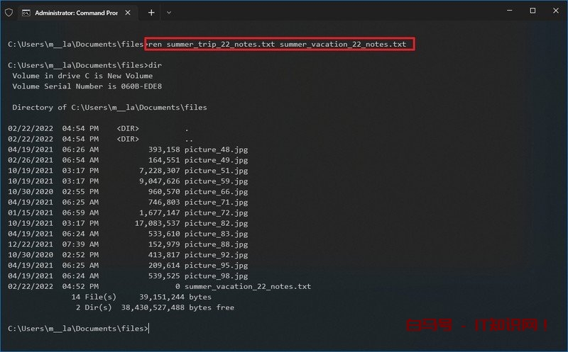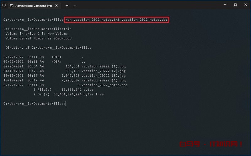 *) 将单个文件的**扩展名从“.txt”更改为“.doc”:ren vacation_2022_notes.txt vacation_2022_notes.doc