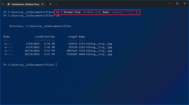 文件名中的空格有时会导致问题,在使用命令时更是如此。 如果您的文件名称中包含空格,则可以使用 PowerShell 将字符替换为视觉分隔符,例如破折号或下划线符号。