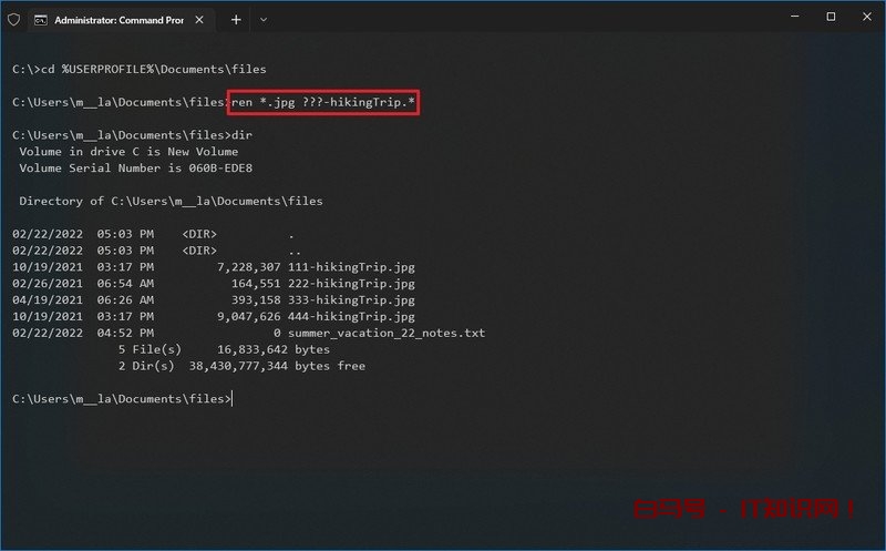 *是一个通配符,它告诉 ren 命令使用特定扩展名重命名所有内容。 问号?也是一个通配符,但它表示要保留为新名称一部分的原始名称的字符。例如,此命令重命名所有“.jpg”文件,保留前三个字符(用作**标识符以避免重复)并将“-hikingTrails”附加到名称: