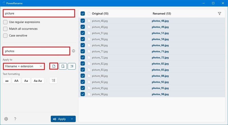 - 使用“应用到”菜单来确认要更改的文件名部分——例如,文件名、扩展名或两者。