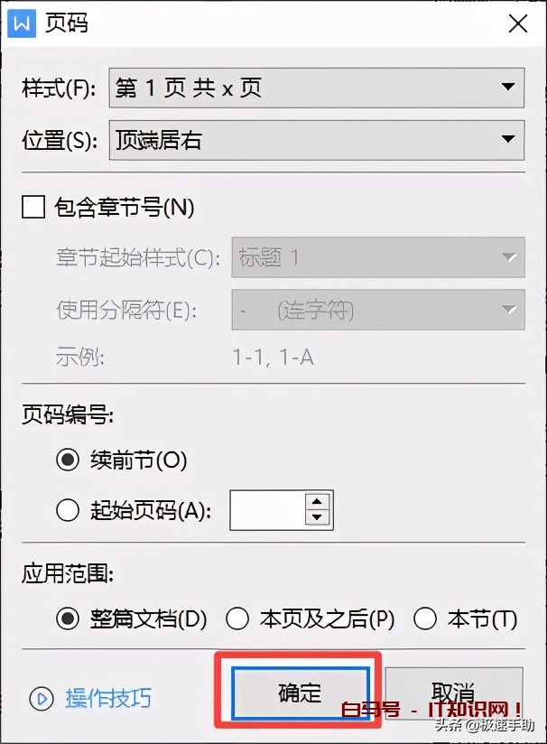 第八步,然后依旧选项插入选项卡中页码下方的页码功能,在弹出的页码设置窗口中,将【页码编号】一栏的选项选择为【起始页码】,并在其后方填写数字【1】;而在【应用范围】中,选择【本页及之后】选项,最后点击【确定】按钮。