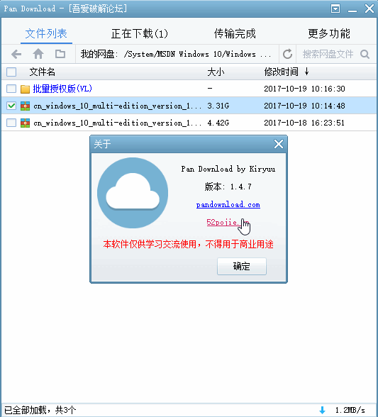 PanDownload,百度网盘高速下载器。这款小巧免费的工具由52pojie原创会员Kiryuu制作,采用了Aria 2技术,支持离线下载、新番下载、提取下载链接、自定义Aria2配置、自定义分享密码,原理类似油猴脚本+IDM,软件获取直链后调用Aria2进行下载,登陆网盘账号获取自己的网盘资源下载。这款超级快的百度网盘下载工具能真正不限速高速下载,大家公认的目前最强大、很好用、最有效的第三方百度网盘下载客户端。