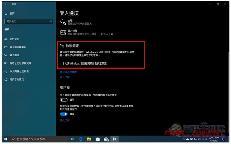功能位置:设定-> 帐户-> 登入选项,就会看到动态锁定功能