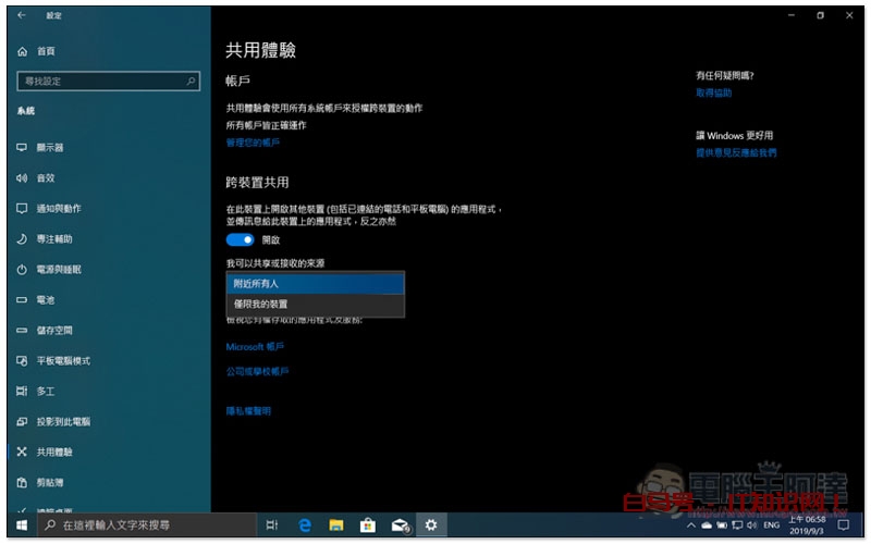 功能位置:设定-> 系统-> 共同体验,于下方「我可以共享或接收的来源」,切换成你需要的设定。
