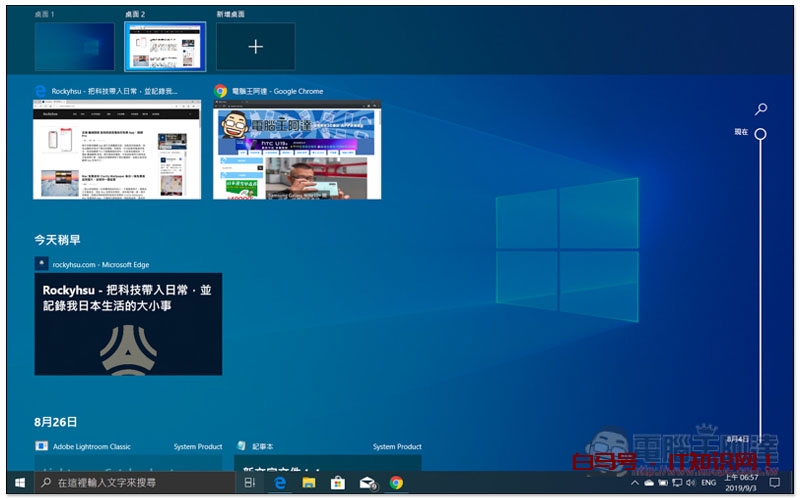 跟macOS 一样,Windows 10 其实也具备虚拟桌面的功能,你可以独立设置每个桌面的工作模式,例如:第一为工作模式,第二为休息放松模式、第三则是影音娱乐之类,每个桌面模式都能个别开启应用程式,而且不冲突,像是你可以在第一、第二都独立开启Chrome。