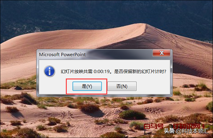 2、PPT放映计时完成之后,然后弹出页面中显示“是否保留新的幻灯片计时”,点击“是”就可以了。