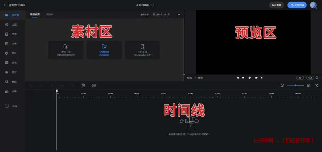 页面布局也比较简单, 左上方是素材区,右上方是视频预览区,下方是时间线。