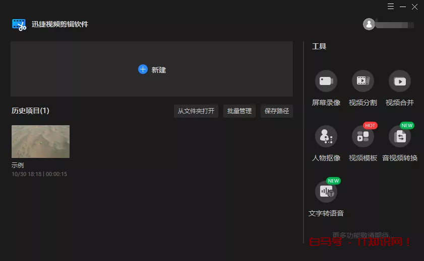 打开软件操作界面,非常简洁,跟B站的视频剪辑布局差不多,但比b站功能更丰富!所有功能都用中文给你罗列的清清楚楚,再也不用害怕寻找半天也找不到功能。