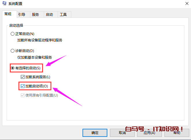 3,在常规选项卡上,点击“有选择的启动”,然后点击以清除“加载启动项”。