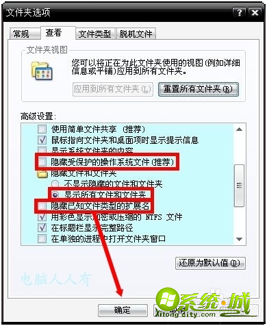 去掉隐藏受保护的操作系统文件、隐藏已知文件类型的扩展名前的对勾→确定。
