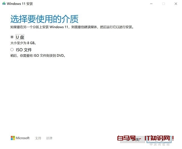 在“选择要使用的介质”界面里,我们选择“U盘”。如果选择“ISO文件”的话,下载下来的就是Windows 11镜像文件。