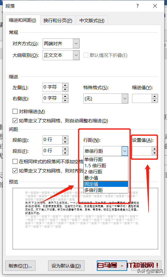 ③、在系统弹出调整行间距的对话框中,我们将“行距”设置为固定值,然后在“设置值”栏目中输入我们想要的行间距数值即可。