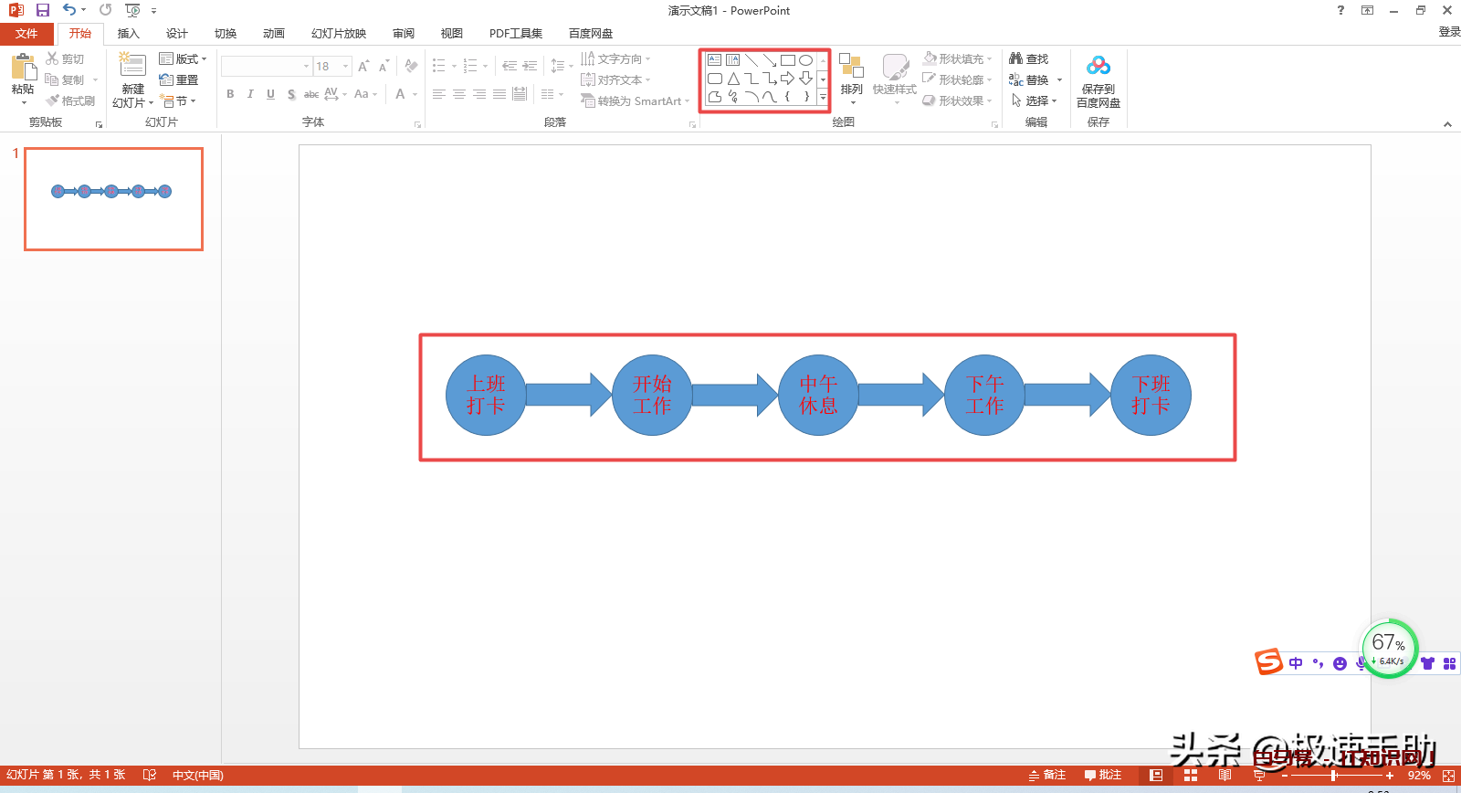 第七步,回到PPT文档界面后,我们就可以获得一个非常美观的流程图了,跟之前自己手绘的流程图相比,更加的简洁美观了。