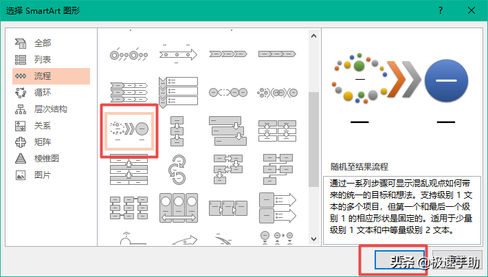 第六步,然后在右侧的界面中,找到一款自己喜欢的流程图,点击选择它,最后再点击【确定】按钮。