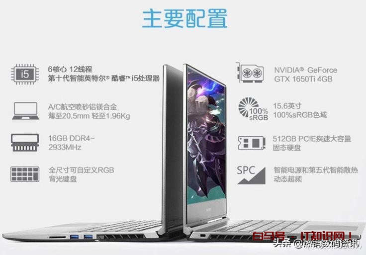 2、配置方面:其处理器搭载了最新的英特尔酷睿11代六核十二线程的i5-10500H处理器,处理器基准频率为2.50 GHz,睿频为4.50 GHz,整体处理器性能还是不错的,其内存为16G DDR4 2933,支持最大扩展到323GB,其硬盘大小为512GB高速固态硬盘。其显卡采用了GTX1650Ti独立显卡,4GB的显存。