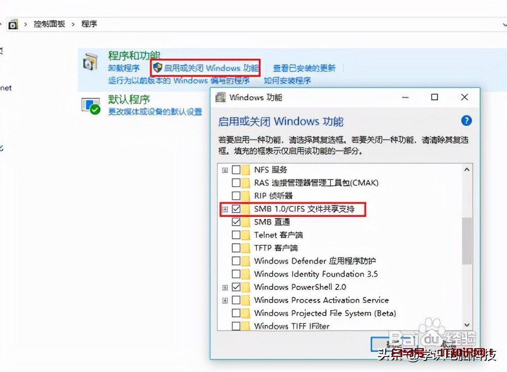 找到控制面板->程序->启用或关闭Windows功能->找到 smb 1.x 。勾选确认。
