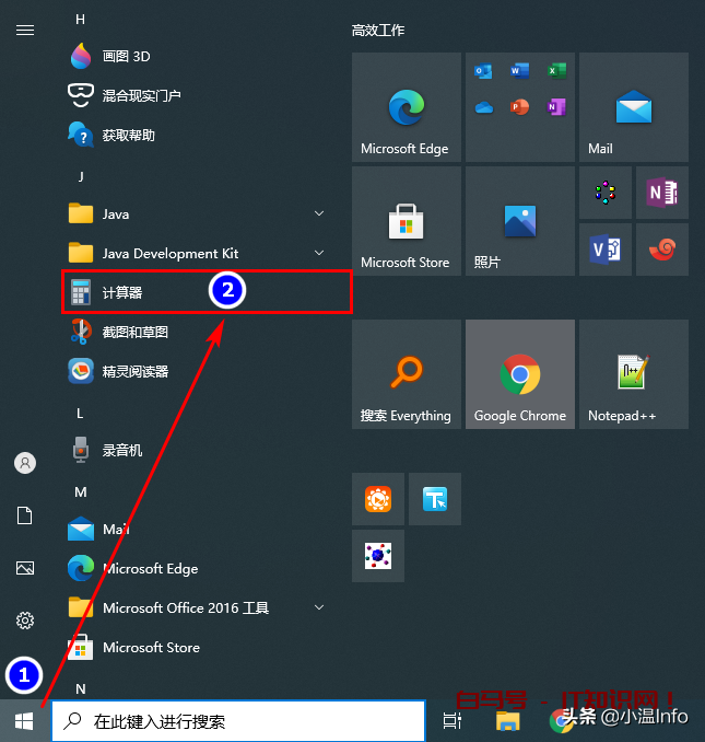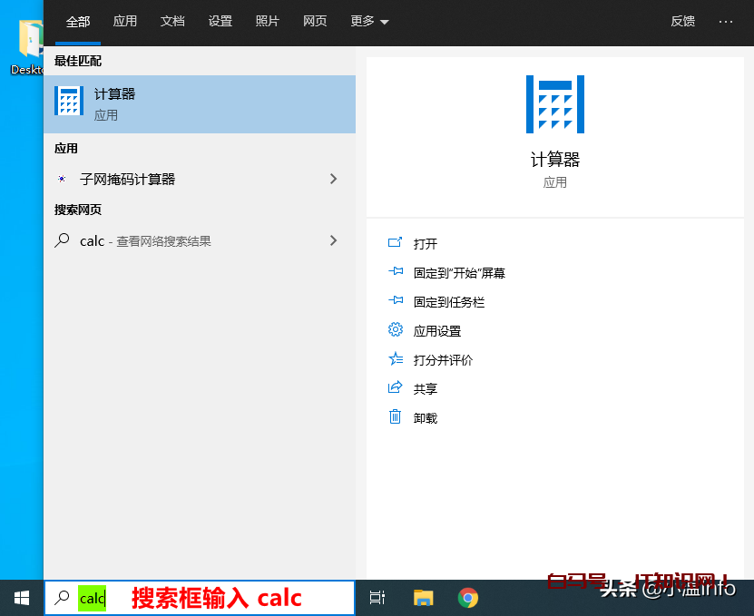 在Windows 10搜索栏输入“计算器” 或 “calc” 打开计算器:
