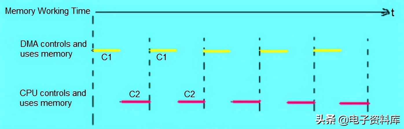 下图是DMA和CPU交替访问的详细时间。C1 专用于 DMA 控制器,C2 专用于 CPU。