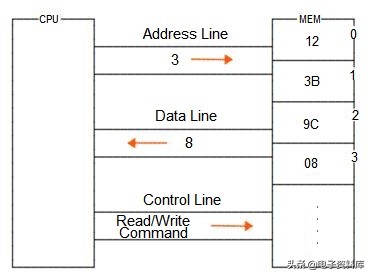 如果CPU要读写内存数据,就必须有电线将它们连接在一起。在计算机中,这种线称为总线。如果你拆开电脑机箱,很容易看到里面有一堆电线。这些线同时发送信号,每根线要么是高电平,要么是低电平。总线按功能不同分为地址总线、数据总线和控制总线。以上图为例,CPU需要读取地址3处的信息,大致分为以下几个步骤: