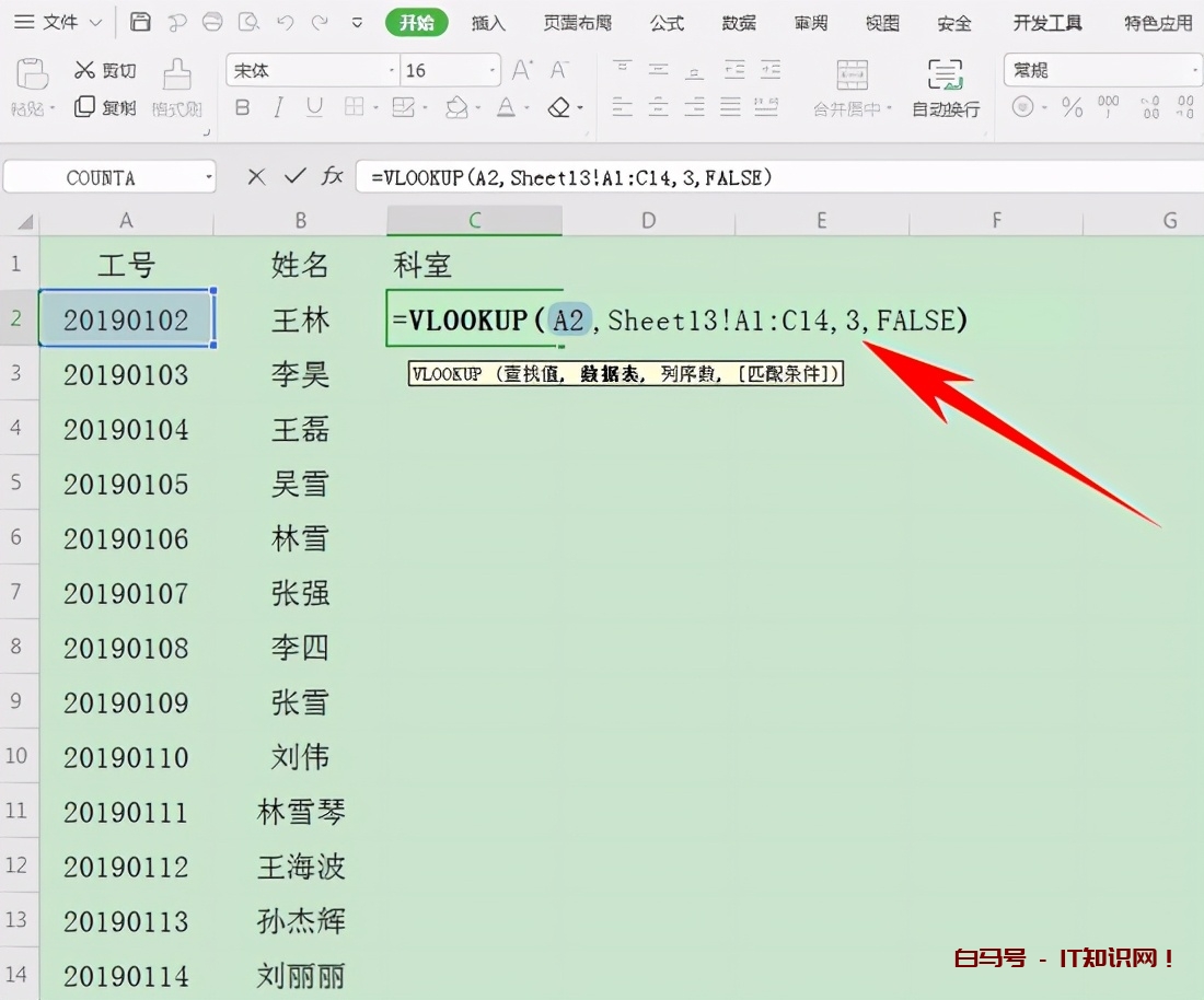 然后在单元格当中输入VLOOKUP函数公式,如下图所示,3代表科室存在于表2的第三列,FALSE代表精确匹配: