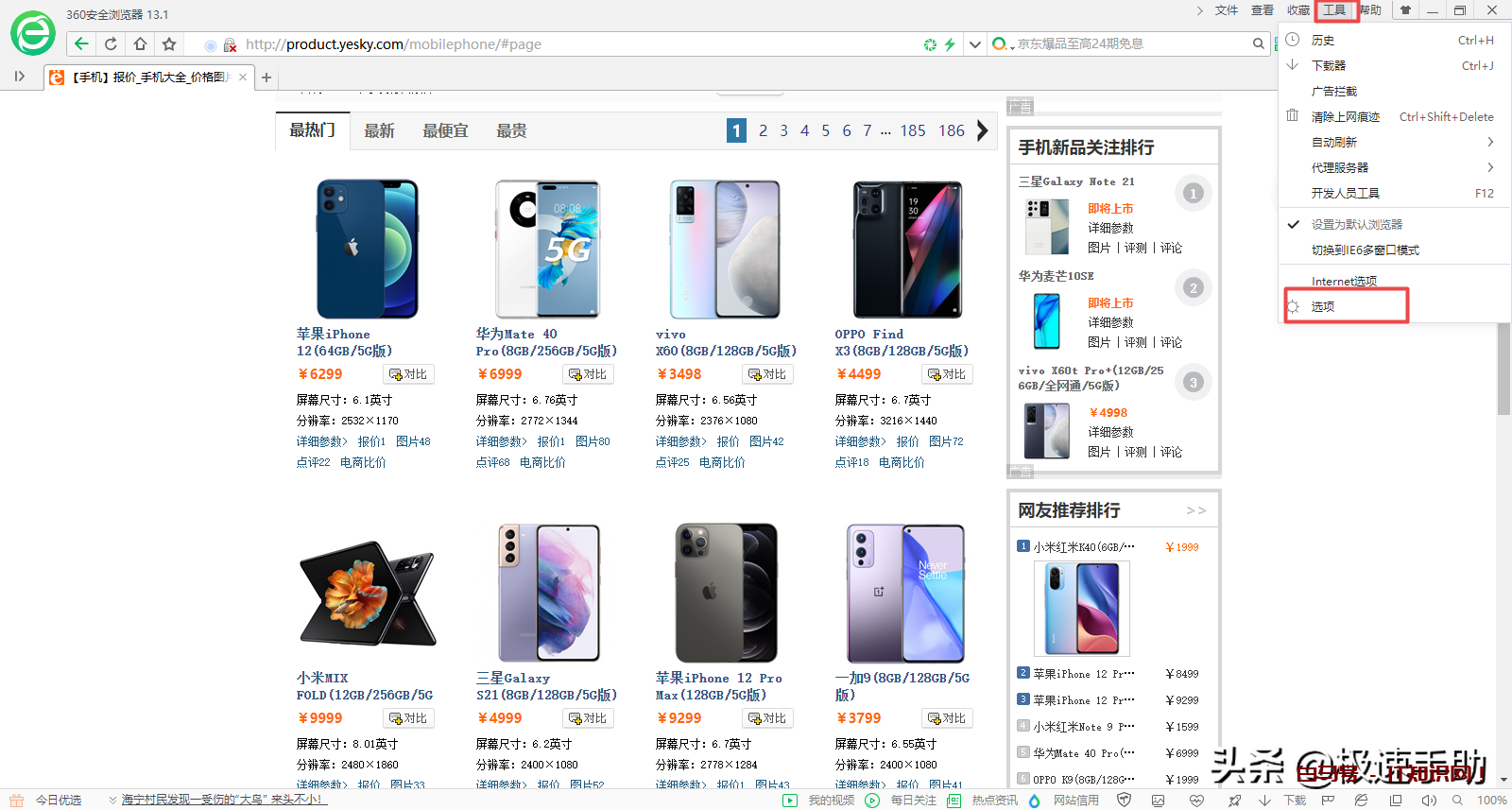 第一步,在电脑上找到360浏览器软件,然后点击打开,进入到浏览器的主界面当中后,找到界面右上角的【工具】选项,并点击打开,然后找到【选项】功能,并点击进入。