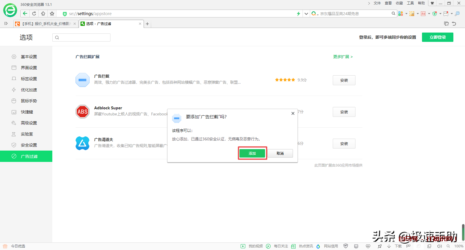 第四步,接着软件会弹出【要添加“广告拦截”吗】的提示窗口,点击【添加】按钮即可。