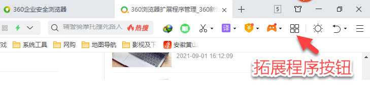 一、打开360浏览器,浏览器的右上方有个四方块按钮,那就是拓展程序按钮(如图)。