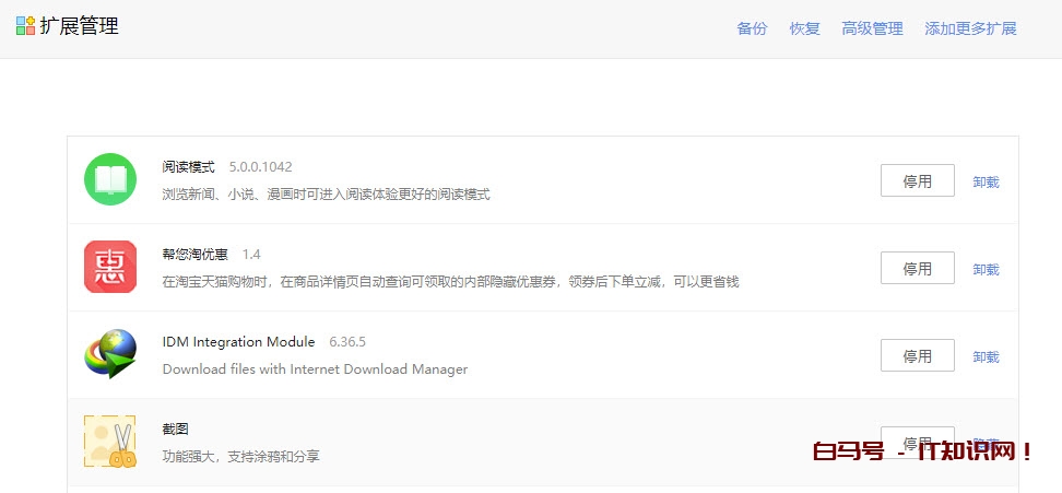 界面中还有“管理”按钮,点击后出现扩展管理界面,就可以选择启用、停用、卸载、隐藏某个拓展程序的选择。扩展管理界面还有“高级管理”按钮,也提供对一些扩展应用程序的管理。