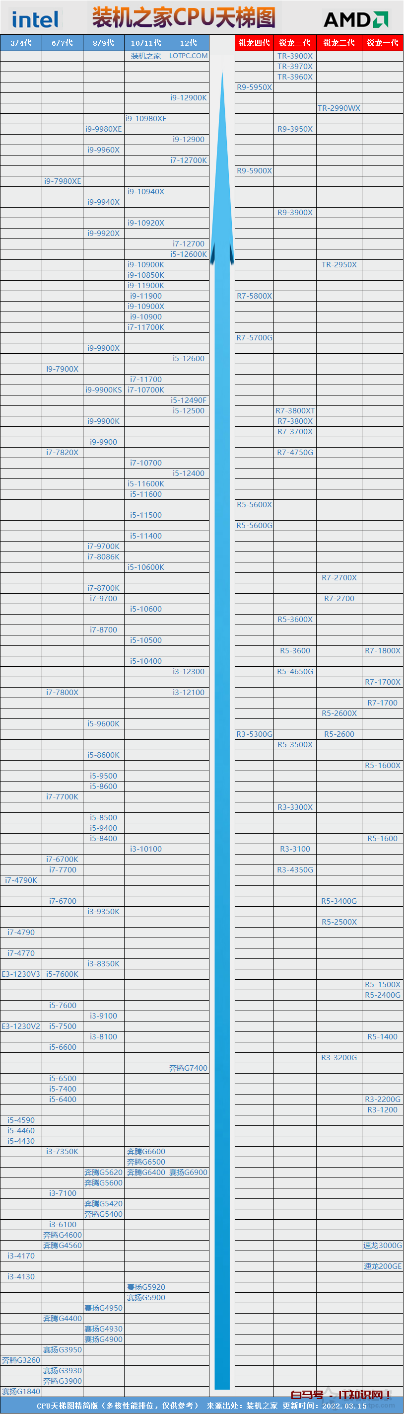 对于小白来是说,对CPU型号认知,一般都只看CPU是i3、i5还是i7的,其实这是选购CPU的最大误区之一,目前还有很多小伙伴没有搞懂。CPU是属于电子产品,所以它是有更新换代的,不同时期的i3、i5、i7处理器,性能也是不同的,就拿intel新推出的12代i5 12600K来说,性能上直接**了上一代旗舰级i9 11900K,所以判断CPU型号的性能高低,我们除了参考CPU评测,最直观的还是CPU天梯图。那么CPU怎么对比性能?下面分享一下台式机CPU天梯图2022年3月份最新版仅供参考。