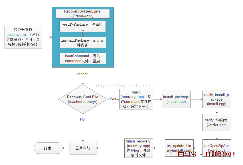 保存升级过程中的log,清除临时文件,包括command文件(不清除的话,下次重启还会进入recovery模式),最后重启。