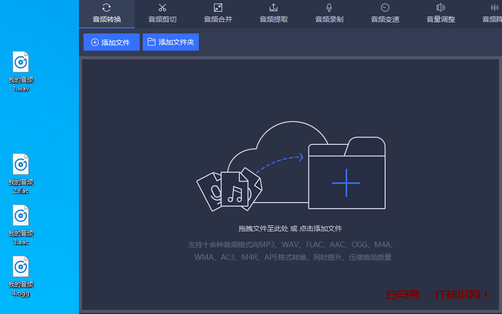 1.如果文件较少,可以直接将音频文件拖动到工具上;如果文件较多,可以点击「添加文件夹」,批量添加音频文件。