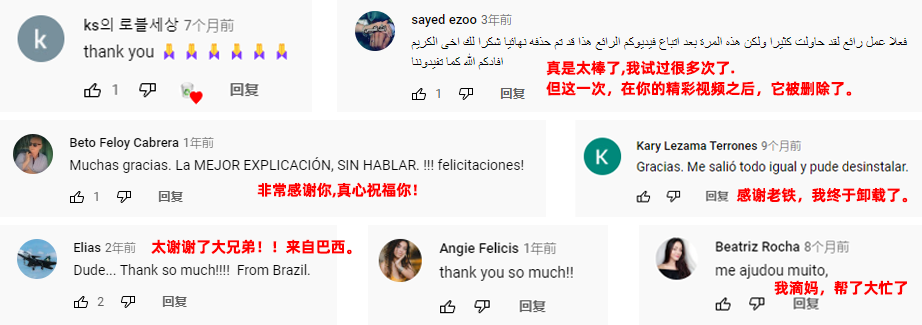 在这类视频评论区下方,各国人民齐聚一堂,他们虽然有着不同的语言,却有着同一个梦想——卸载 360 安全卫士。也因为按照视频步骤,成功卸载了 360,他们脸上终于露出了久违的笑容。
