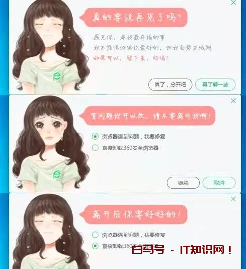 虽然对于咱们来说,这些套路已经见怪不怪了。但估计谁也讲不清楚,国内电脑软件到底什么时候玩起「卸载伤痛文学」的。每每世超要卸载一个软件,都像是要辜负一个深爱着我的女孩。重要的是,她还一片痴心,并对我报以最诚挚的祝福,我还真有点下不去手。说出来你可能不信,我跟浏览器网恋了 ▼