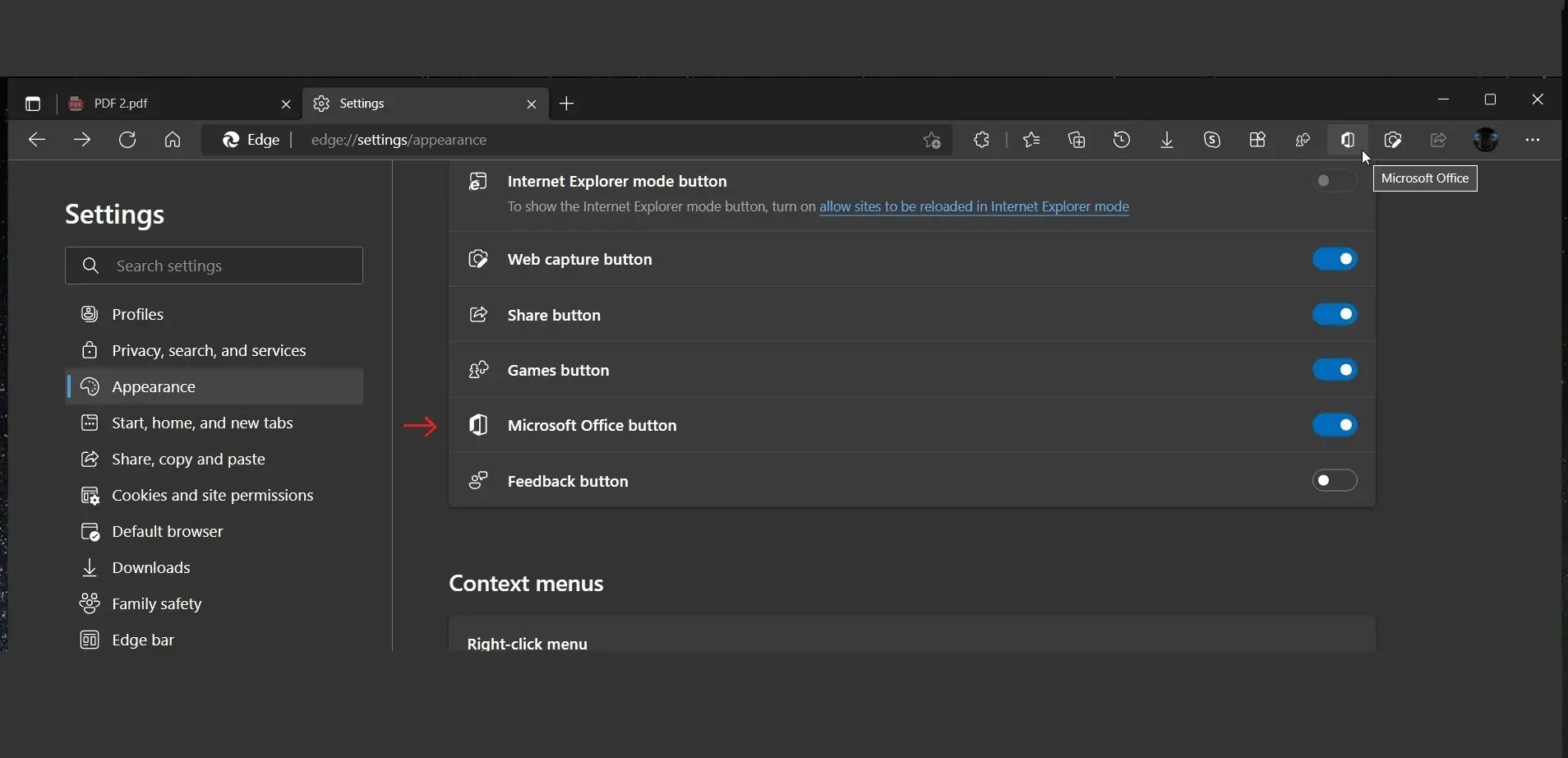 这个页面允许激活或停用出现在地址栏旁边的 Internet Explorer 模式、网络捕捉、共享、游戏和其他按钮的外观。微软办公室的切换按钮就在反馈按钮的上方。即使你不启用它,微软仍然在省略号菜单中增加了微软办公室的访问,如下图所示: