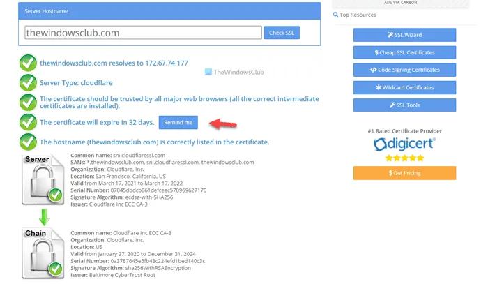 要解决 此服务器此时无法证明其安全证书无效的 问题,您需要按照上述解决方案进行操作。 也就是说,您需要清除缓存、刷新 DNS、检查 SSL 到期日期等。最重要的是您需要验证 SSL 安装。