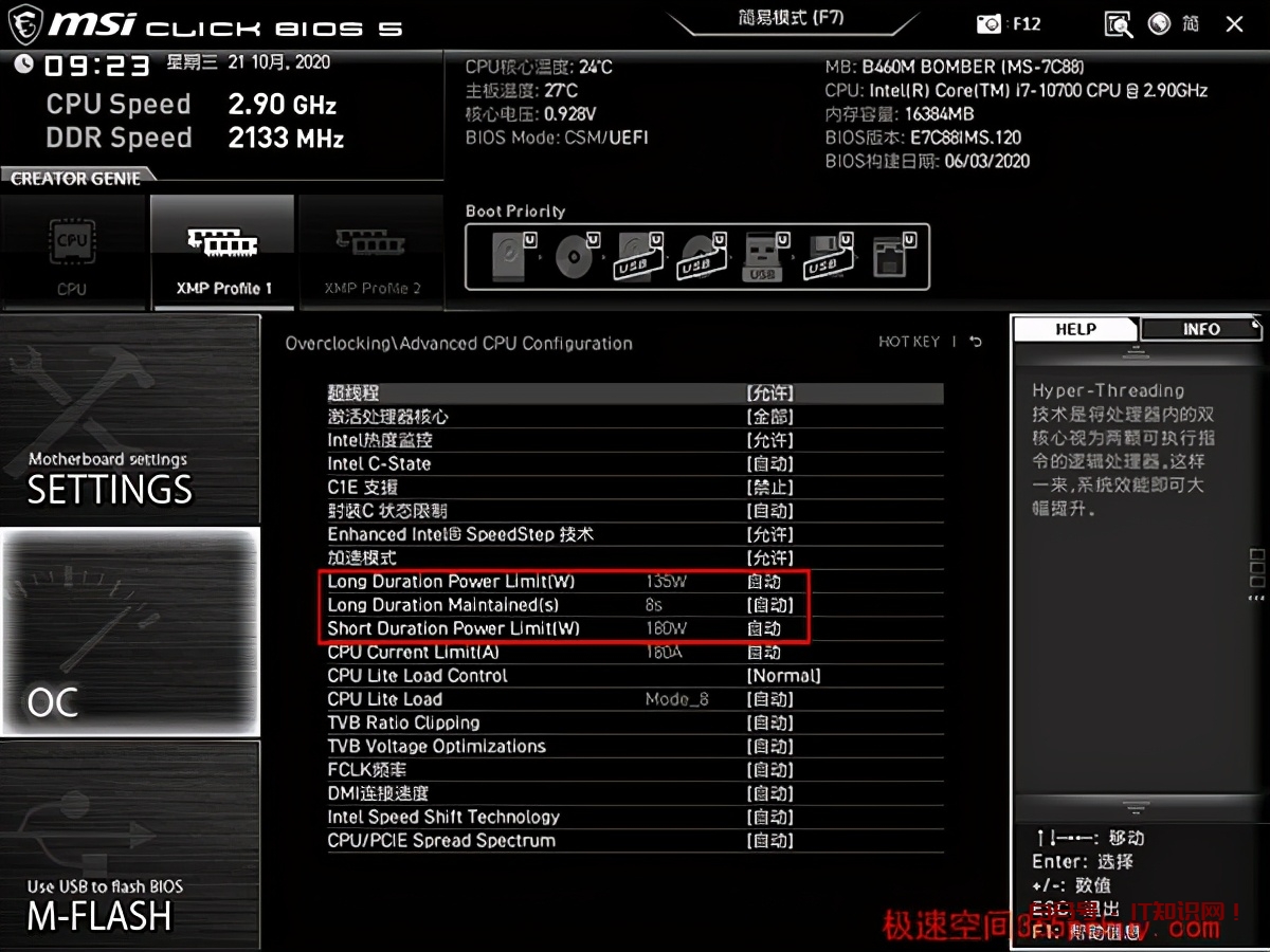 B460M BOMBER的PL1/PL2默认解锁到135/180W 。(本身B/H主板系列intel不允许超频,但通过解锁PL1功耗墙,可以让全核运行到更高水平,实际上也起到了“超频“的作用。)